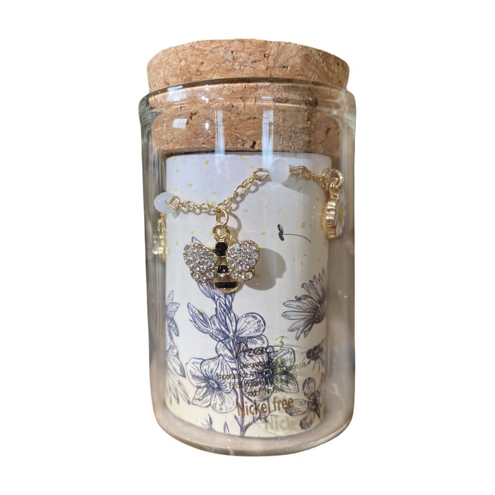 Questo braccialetto è realizzato in metallo e presenta un adorabile ciondolo a forma di ape. Ciò che lo rende ancora più speciale è la confezione regalo: ogni braccialetto è contenuto in un elegante provetta in vetro con tappo in sughero. Un tocco di natura e originalità!