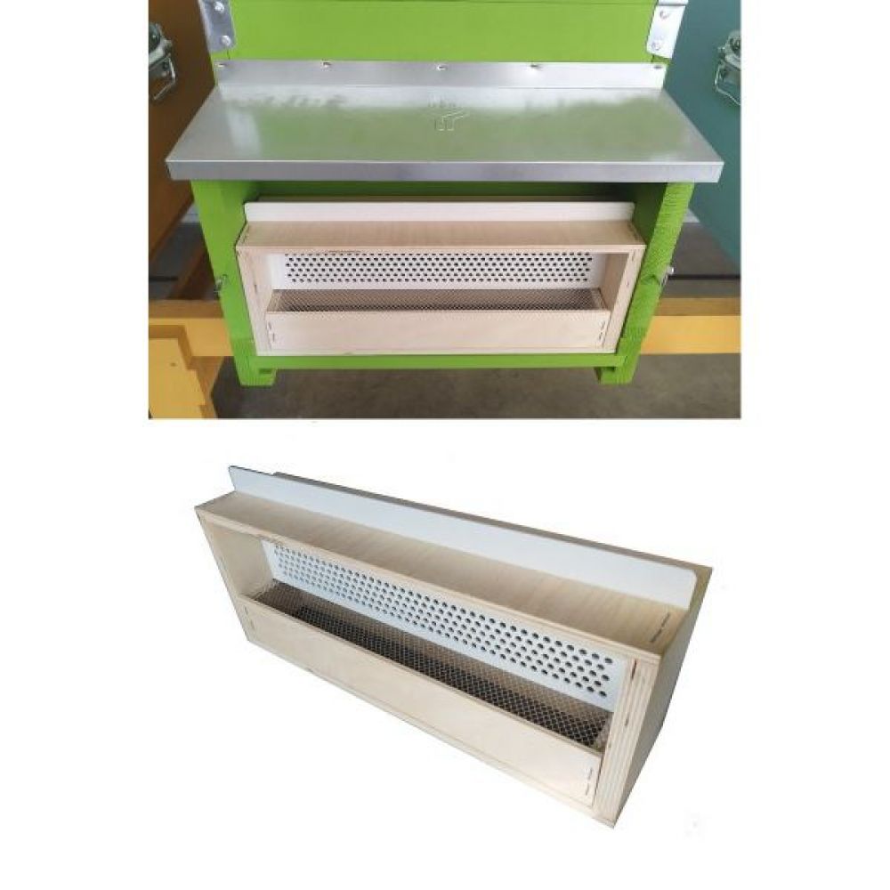 La trappola è appositamente progettata per le arnie con portichetto, garantendo un posizionamento preciso nel davanzale frontale dell'arnia. Realizzata con materiali di qualità, compresi legno, metallo e plastica, la parte contenitore è realizzata in rete metallica, assicurando una durabilità e un'elevata funzionalità nel raccogliere il polline dalle api in modo pratico ed efficiente.